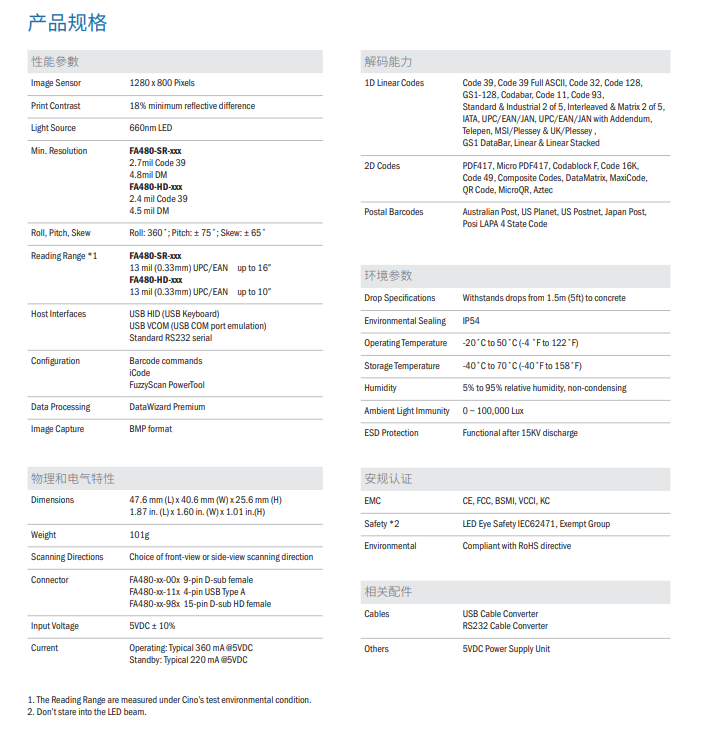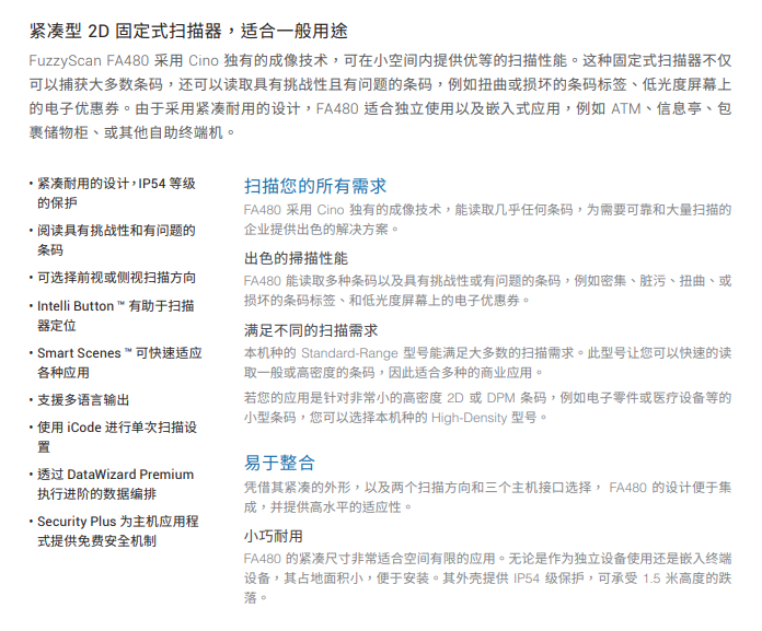 FA480固定式扫描器系列具备创新FuzzyScan 3.0影像技术和超小尺寸的外观设计,兼具出色的扫描性能和工业水平等级,提供用户更可靠耐用且稳定的自动化条码读取设备,FA480扫描器可以提高生产效能且能广泛应用在您的产线,符合成本效益、创造良好的价值。