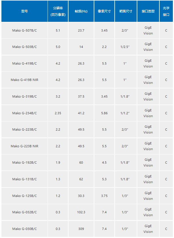 Mako相机价格极具吸引力,外壳紧凑,耐用且达成工业等级。此款相机采用符合Gige Vision 或USB3 Vision标准的接口技术,可与您的主机系统和图像处理解决方案实现可靠连接。螺纹安装连接器和多个输入/输出等基本功能推动简单的系统集成。Mako相机搭载CCD和最新的高品质CMOS传感器,可为实现未来应用提供支持。