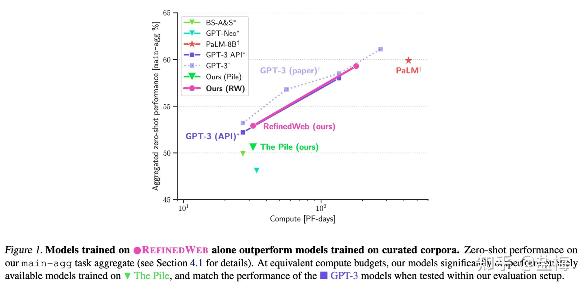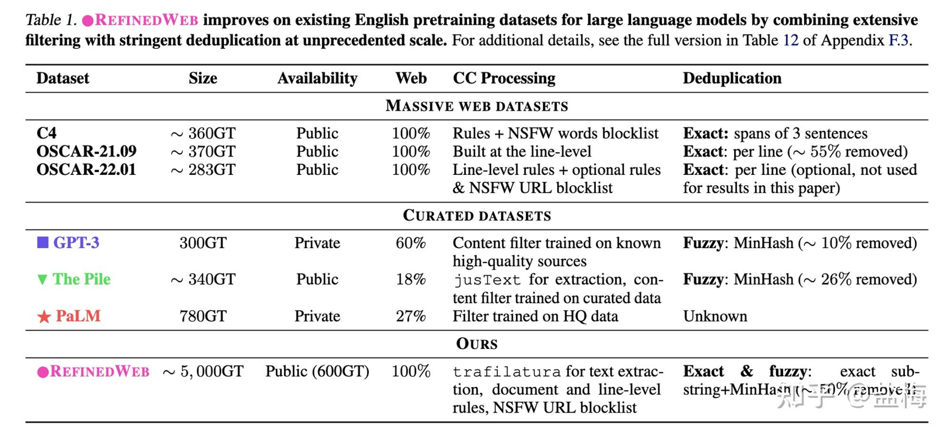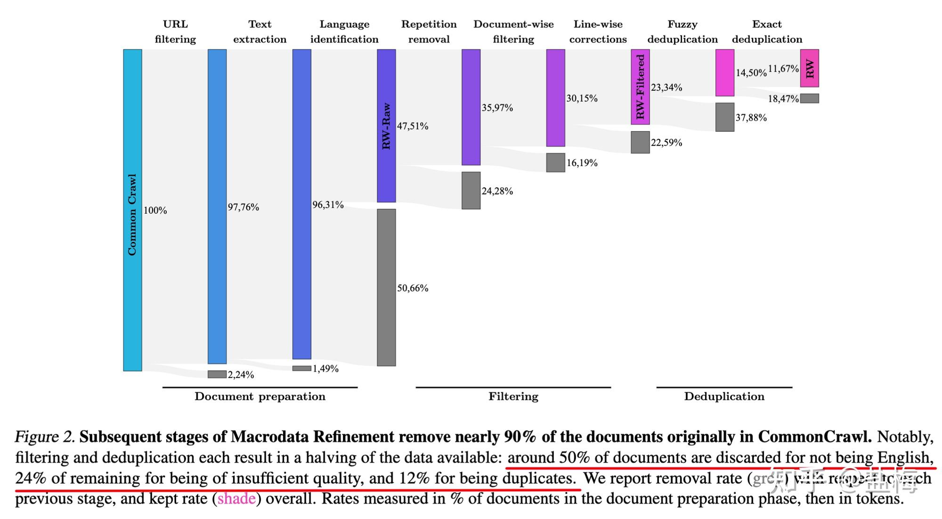 但事实真的如此么?我们是否能仅用web data通过更好的清洗过滤策略就能训练出一个强大的模型呢?来自阿联酋阿布扎比技术创新研究所(TII)的团队就这一问题展开了研究,论文题目为The RefinedWeb Dataset for Falcon LLM: Outperforming Curated Corpora with Web Data, and Web Data Only。下面是论文的解读以及笔者自己的一些思考。
