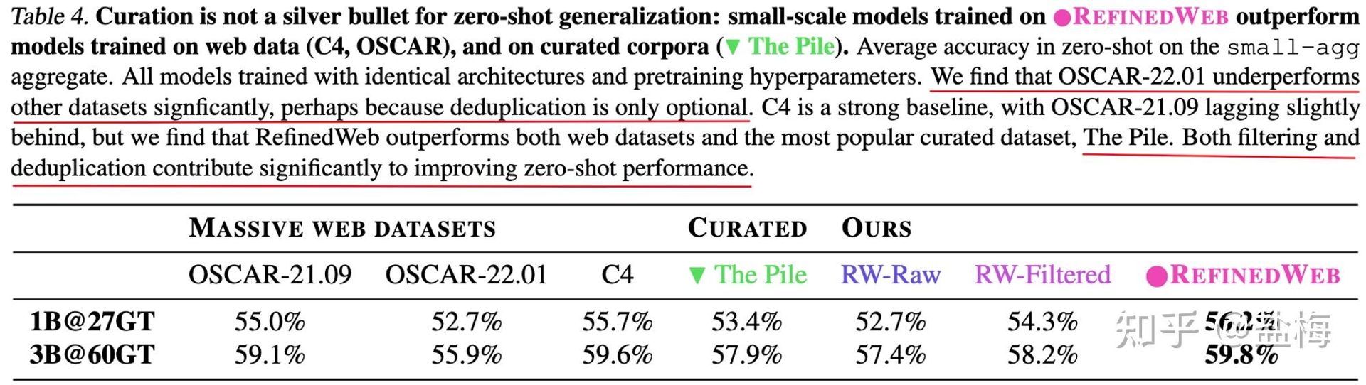 作者做的RefinedWeb数据集则显著好于之前的网页数据集C4(T5的训练数据),以及The Pile(Bloom的训练数据),说明仅仅用web数据好好清洗,也能战胜专有数据。其中The pile数据集作者在上文中也提到,其虽然有过滤和去重,但门槛太低了,导致很多重复的内容其实并没有很好的被过滤。