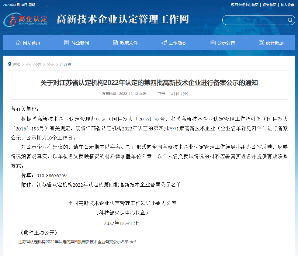 根据《高新技术企业认定管理办法》(国科发火〔2016〕32号)和《高新技术企业认定管理工作指引》(国科发火〔2016〕195号)有关规定,现将江苏省认定机构2022年认定的第四批7971家高新技术企业(企业名单详见附件)进行备案公示。苏州仁创信息科技有限公司名列其中。