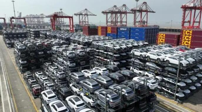 2023年7月11日,在江苏省太仓港国际集装箱码头,一批新能源汽车即将通过专用框架运输方式出口(无人机全景照片)。新华社发(计海新 摄)