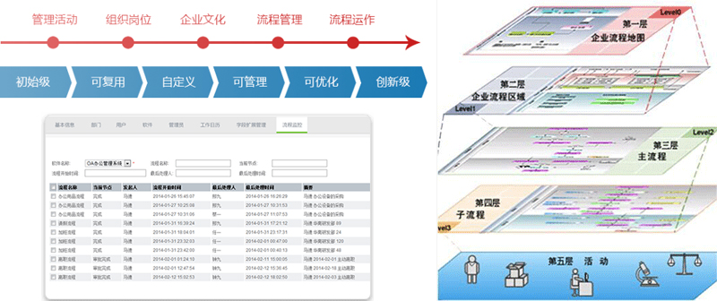 BPM流程管理系统根据处在不同流程阶段的企业,在管理活动、组织岗位、企业文化、IT支持(流程管理和流程运作)等方面的不同表现,BPM系统将流程分为初始级、可复用、已定义、可管理、可优化和创新等6个等级。