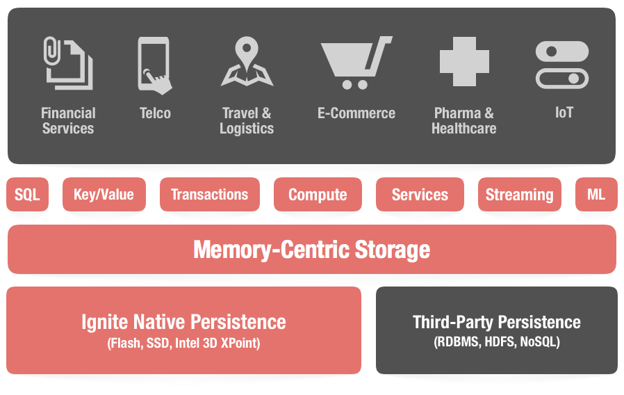 Apache Ignite的SQL支持级别非常广泛,因此该平台被广泛用作成熟的SQL数据库。将Ignite的SQL功能与其分布式核心结合在一起,您可以获得水平可扩展,容错且始终可用的SQL数据库。借助Ignite Durable Memory 体系结构,可以将数据和索引存储在内存中,也可以存储在磁盘上。这允许跨不同内存层执行分布式SQL操作,并通过磁盘的持久性实现内存中性能。