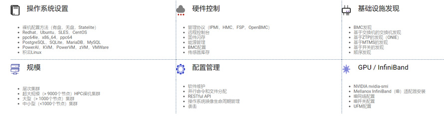 多种安装模式选择:有盘安装(diskful install),无盘无状态(Stateless)、无盘有状态(Satelite)、iSCSI、虚拟机(VMWare、KVM、Xen、PowerVM、zVM)