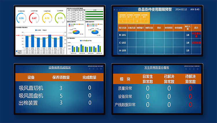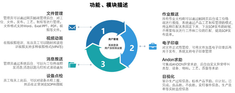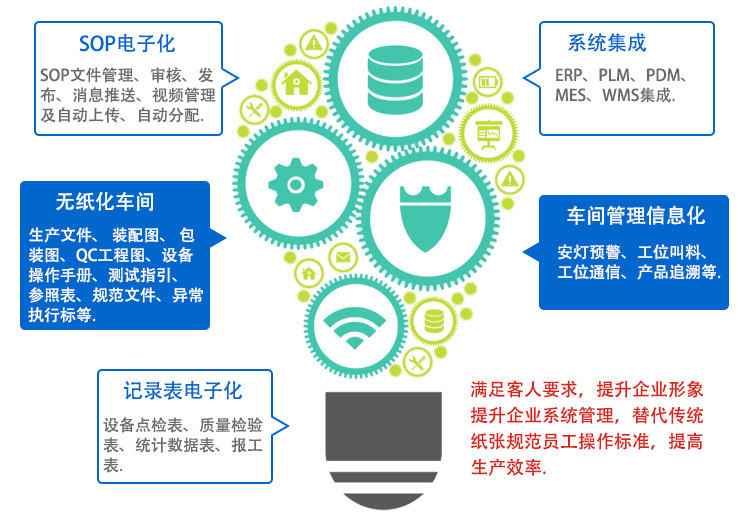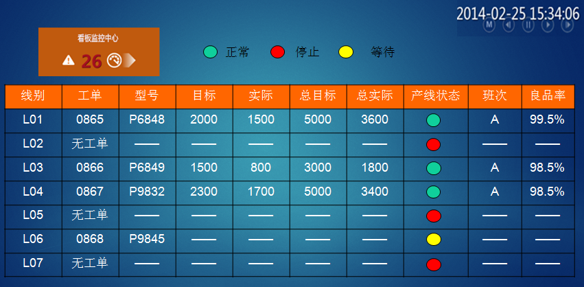 车间电子看板(SOP)系统是目视化管理,及时、准时化管理、可视化管理、精益生产的一部分,也是MES系统的一部分。当然,也可以单独使用。SOP是落实TPS(精益生产)以及JIT(准时制无库存生产)的重要工具,由三部分组成:车间现场数据采集装置(按灯、PDA、PLC等)、硬件设备(LED、液晶屏、报警灯等)、看板系统并集成其他信息化软件(ERP、 MES系统 等),系统通过电子看板以报表或图表化形式展现车间生产过程中各项数据(生产派工数据、实时物料数据、实时生产数据、设备运营状况数据、产品品质数据、仓库库存数据等),实时、准确、高效!