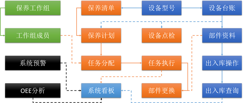 TPM设备管理系统其主要系统功能包括:系统权限控制、数据采集与OEE分析、设备资产管理、维修与保养管理、分析统计和报表管理、备件库存管理等。